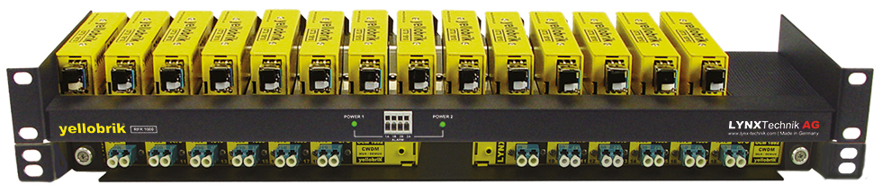 与 RFR 1000 机架(最多可容纳14个光纤 yellobrik)组合使用时,一个功能齐全的18通道模块化 CWDM 系统可以容纳在总共 1.5RU 机架空间。