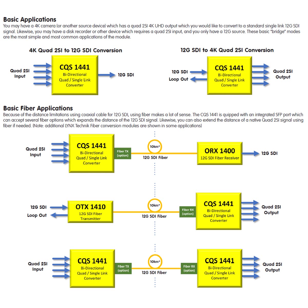 CQS 1441 是一款紧凑型解决方案,旨在将四路 3G-SDI 链路桥接至单路 12G-SDI 设备,仅支持 2SI,不支持 SQD。