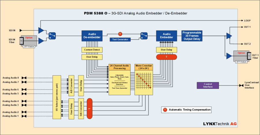 PDM 5388 O 是一款功能多样的 8 路模拟音频加嵌器或解嵌器,可用于解决广播中的各种音频问题。该模块支持多种格式,包括高达 1080p60 的 3G-SDI 格式,并配有可选的光纤输入/输出。