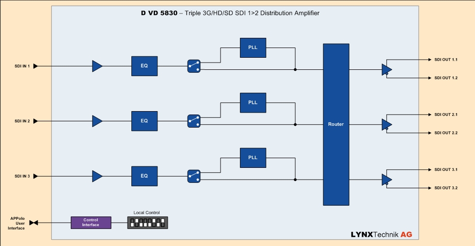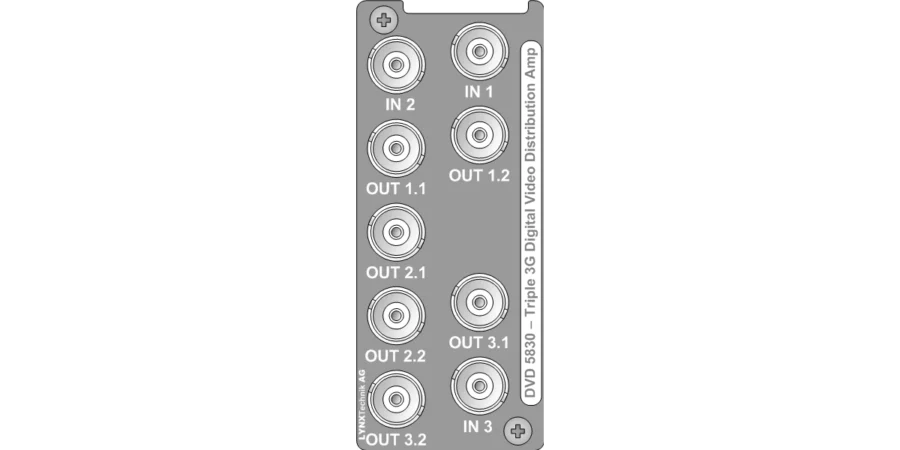 DVD 5830 是一款灵活的 3 路 3G-SDI 分配放大器。默认情况下,它以 3>2 模式运行。输出可以自由映射到任何输入,从而实现诸如 1>6 或 1>2 + 2>4 等各种分配模式。每个通道都可以设置为时钟再生模式或非时钟再生模式。自动检测输入视频标准。在非时钟再生模式下,该板卡可在 15Mbit/s 至 3Gbit/s 之间透明地传输任何数据。支持 ASI/DVB 和 SMPTE 310 信号。所有 SDI 输出均为非反相输出,因此非常适合与 ASI 信号配合使用。此板卡非常适合要求苛刻的数字多格式广播和专业应用。通过卡边缘集成的拨码开关提供本地设置。该板卡与 LynxCentraal 完全兼容。可以通过使用 Windows 或 MacOS 操作系统,对其进行配置、控制和更新。
