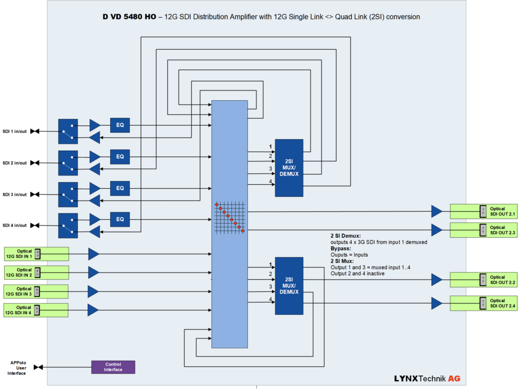 • 支持四路 12G/6G/3G/1.5G-SDI• 1>8 12G-SDI 分配模式(4 路微 BNC 和 4 路光纤输出)• 4路 1>1 12G-SDI 微 BNC 到光纤转换器• 2路12G-SDI 到 3G-SDI 四链路 2SI 转换器• 2路3G-SDI 四链路 2SI 到 12G-SDI 转换器• 1路 12G-SDI 四链路 到 单链路光纤 8K 转换器• 1路 8K 单链路光纤到 12G-SDI 四链路转换器• 输入状态LED指示灯• 与 Lynx APPolo 控制系统配合使用时支持远程控制、状态监测和错误报告• 热插拔