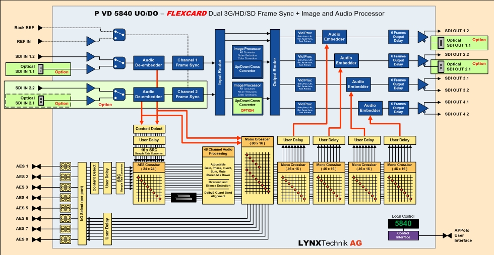 基本模块是一个单路多格式帧同步器,提供四个输出通道,每个通道都有自己的视频处理器和音频加嵌器。内部图像处理资源包括两个ARC通道,一个高品质的上/下/交叉转换器,两个降噪通道和两个RBG色彩校正通道,所有这些都可以使用内部信号路由器进行用户映射。