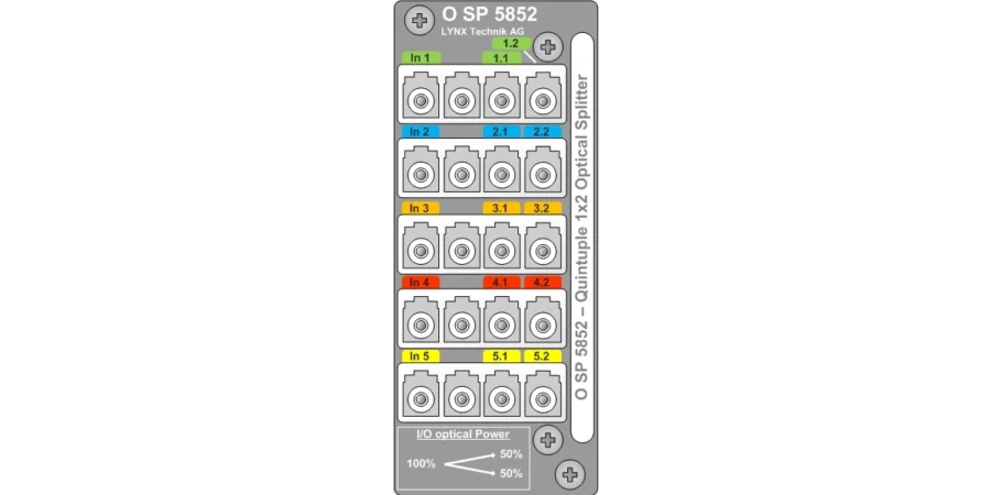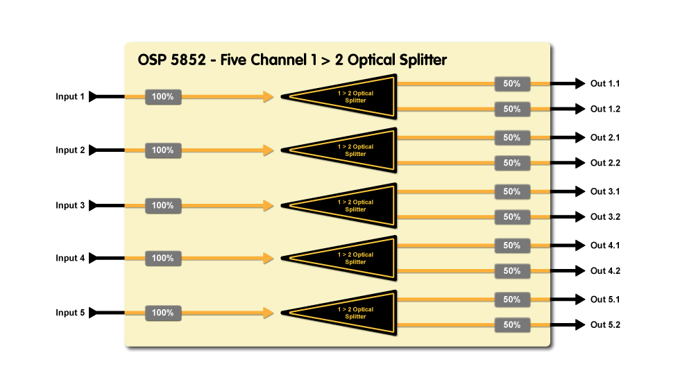 OSP 5852 在单个板卡中提供5个独立的 1> 2 光分路器/合路器。对于每个通道,光输入被分为2个输出,每个输出具有50%的输入功率。