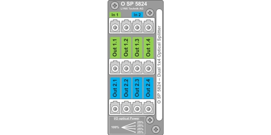 OSP 5824 在单个板卡中提供2个独立的 1> 4 光分路器/合路器。对于每个通道,光输入被分为4个输出,每个输出具有 25% 的输入功率。