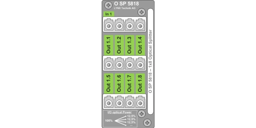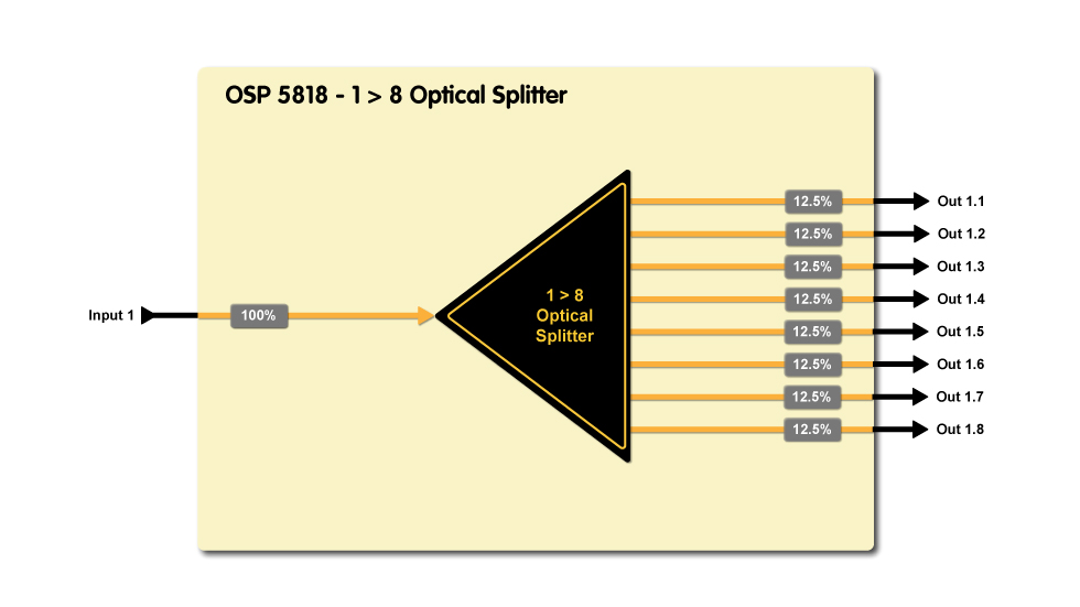 OSP 5818 是 1> 8 的光纤分路器/合路器。光输入分为8个输出,每个输出具有输入功率的12.5%。