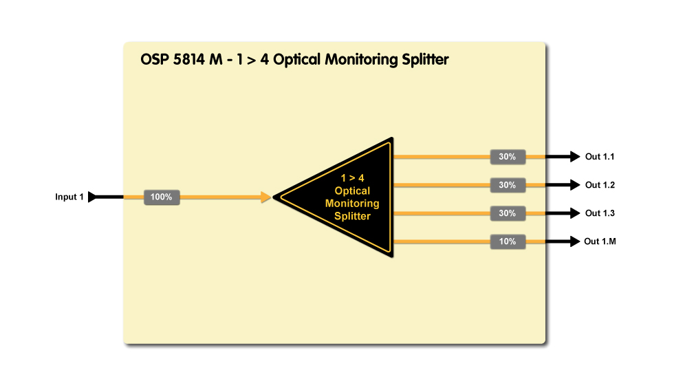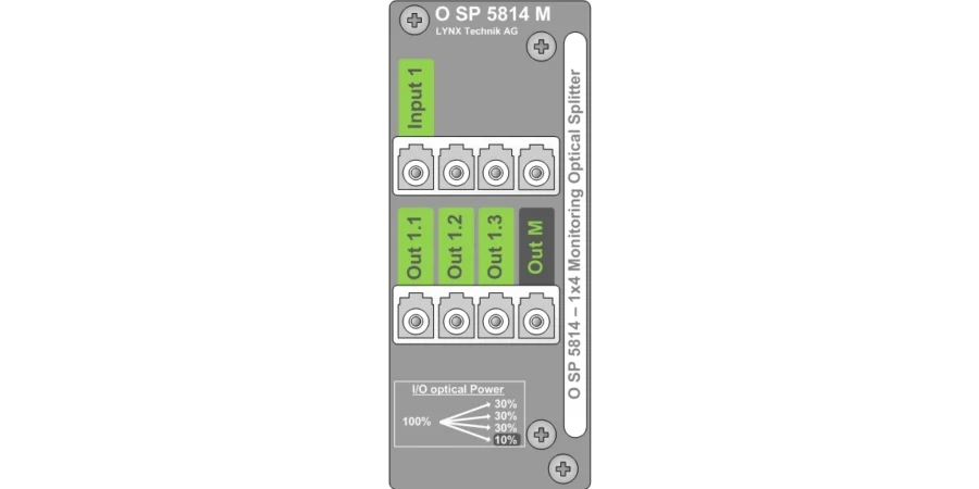 OSP 5814 M 是一款 1>4 的光分路器/合路器。光输入被分成 4 个输出端,每个输出端的功率均为输入功率的 25%。该板卡在运行时是无源的,这意味着它不需要电源,并且与所有5000系列机架都机械兼容,可以从机架的后部安装模块。